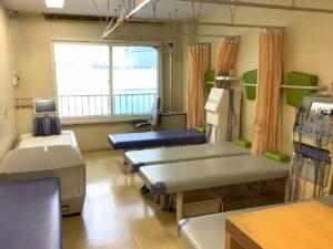 当院の2階はすべてリハビリスペースとなっており、10名の理学療法士と3名の柔道整復師が在籍しています。